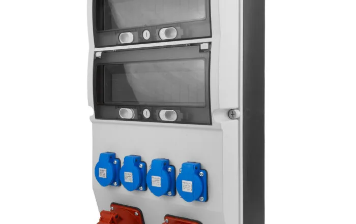 | 230V 16A Steckdosen | 4 x 230V 16A 2p+E IP54 blau Typ E französisches System Typ 11111 Mennekes abgesichert mit Leitungsschutzschaltern SEZ: 2 x C16A 10kA 1P |