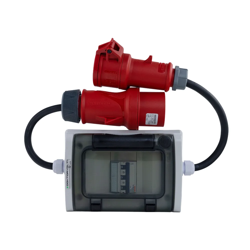 Der Adapter ist mit Mennekes-Steckern und einer dreipoligen Mennekes-Buchse ausgestattet. Die Verwendung von Komponenten der renommierten Marke Mennekes sorgt für die Zuverlässigkeit der elektrischen Verbindungen des Geräts.
