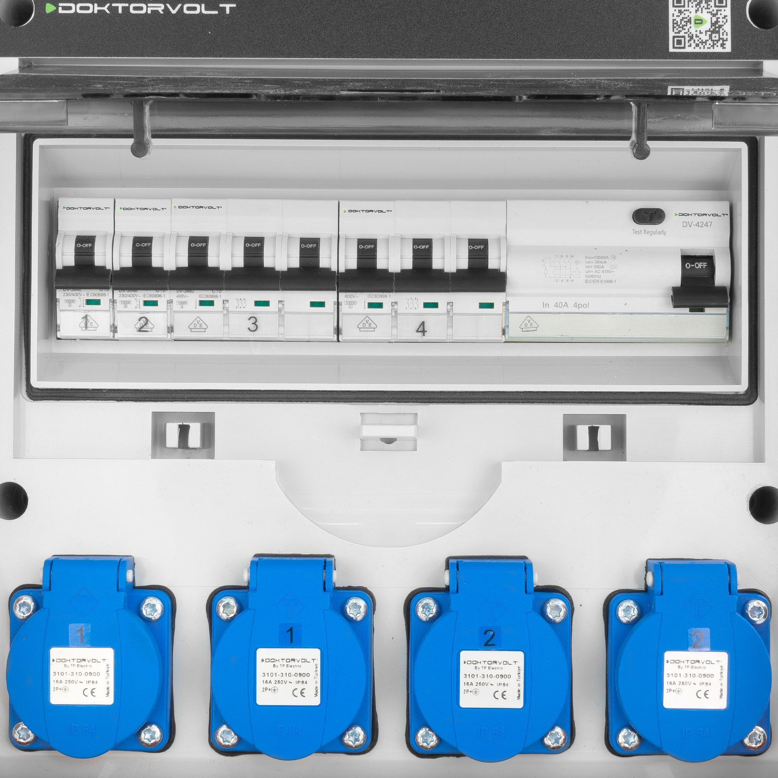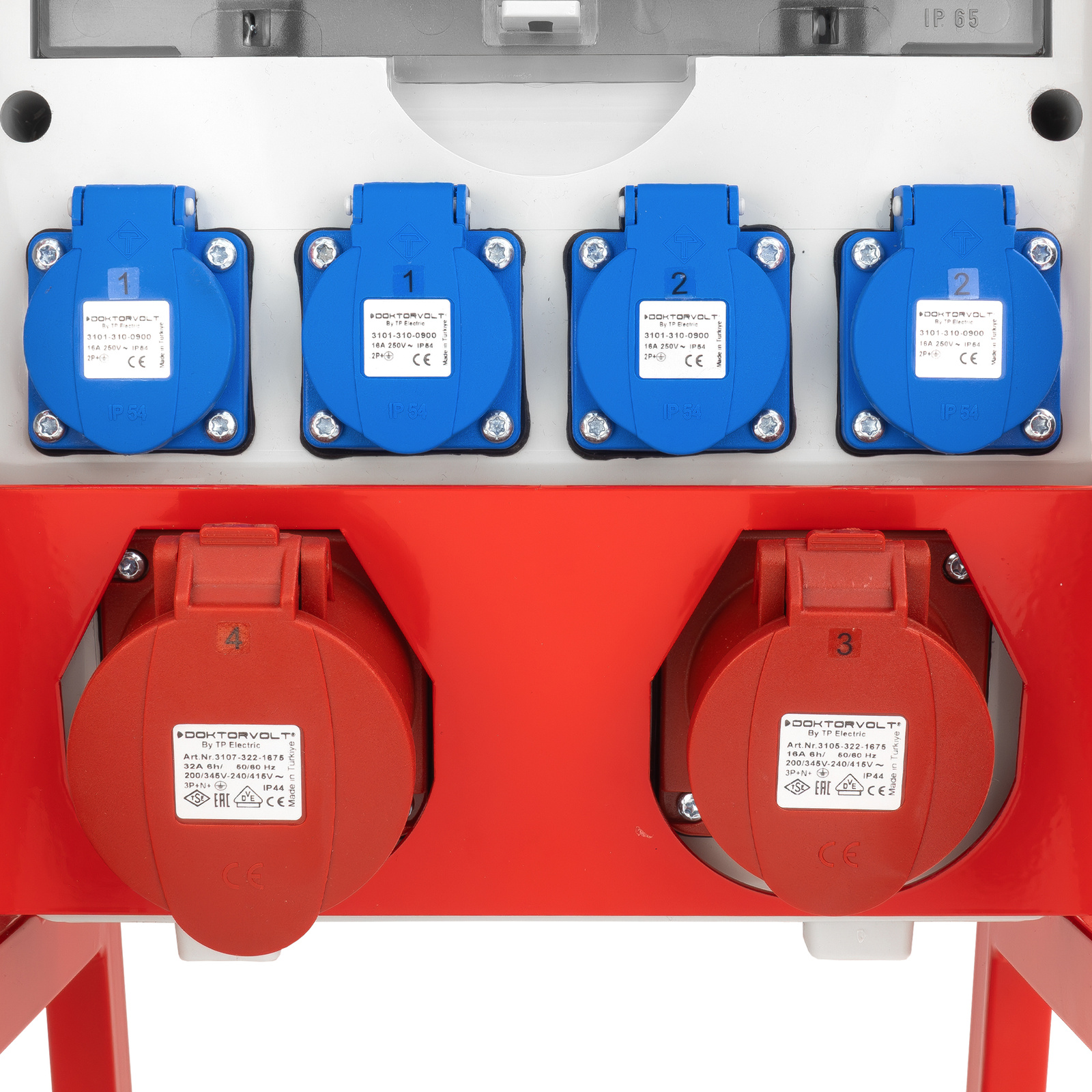 Robuste IP44-Baustromverteiler mit 4 x 230 V und 2 CEE-Steckdosen (400 V). Sie sind aus hochwertigen Materialien hergestellt. Der Stromverteiler ist mit einem 12-moduligen Revisionsfenster ausgestattet.