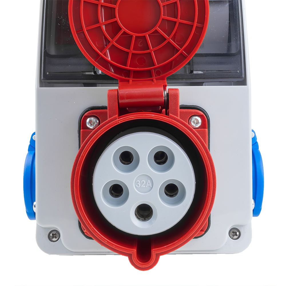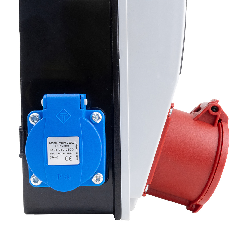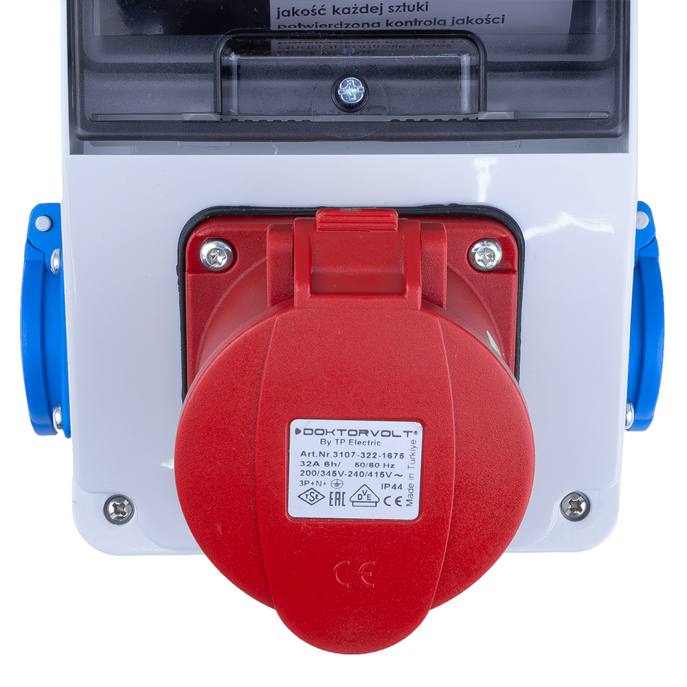 Hochwertiger Baustromverteiler XS DV-5084-D 32A 2x230V ohne Absicherung. Ausgestattet mit Steckdosen der renommierten Marke DOKTORVOLT. Schutzart IP44 . Stromverteiler Komplett Verdrahtet.