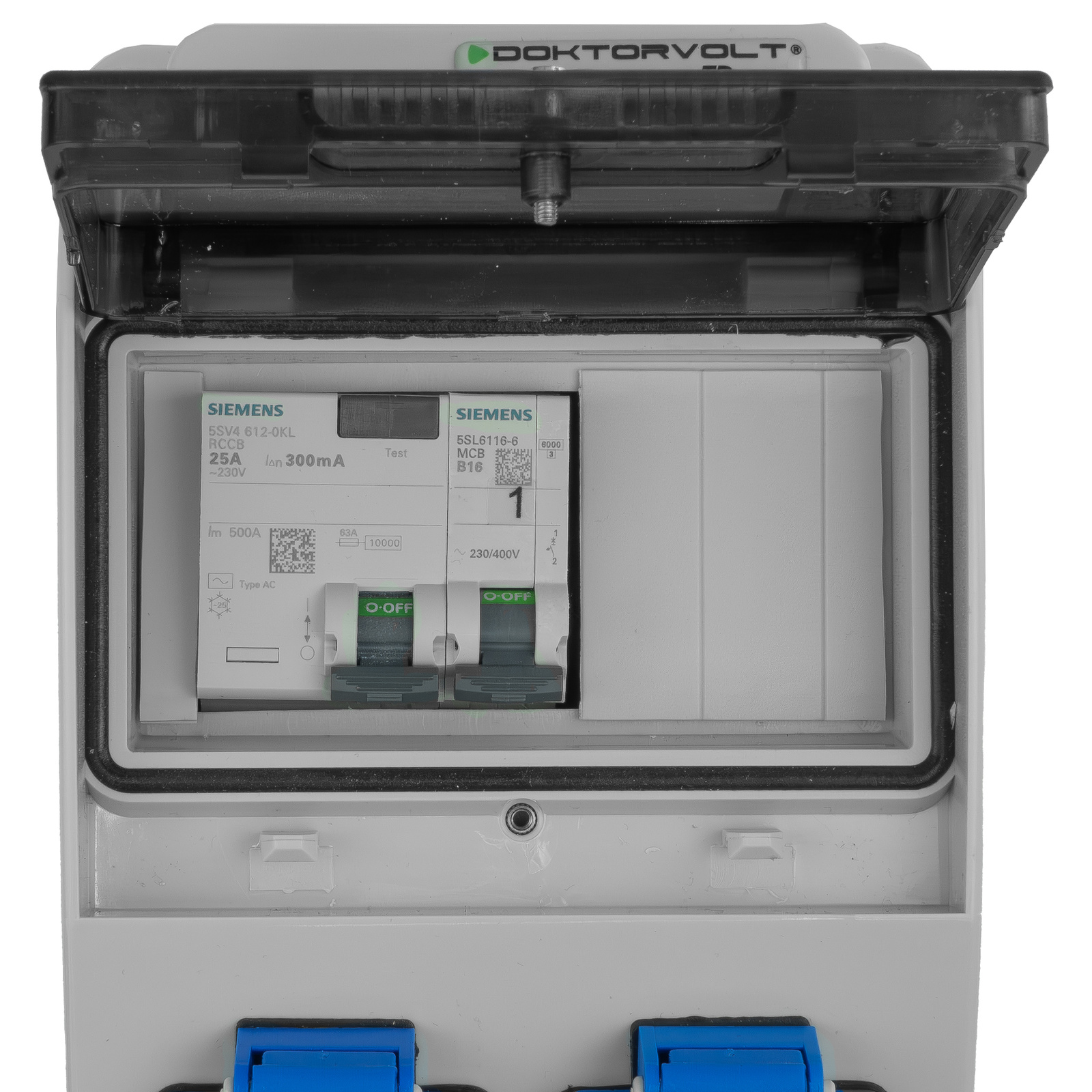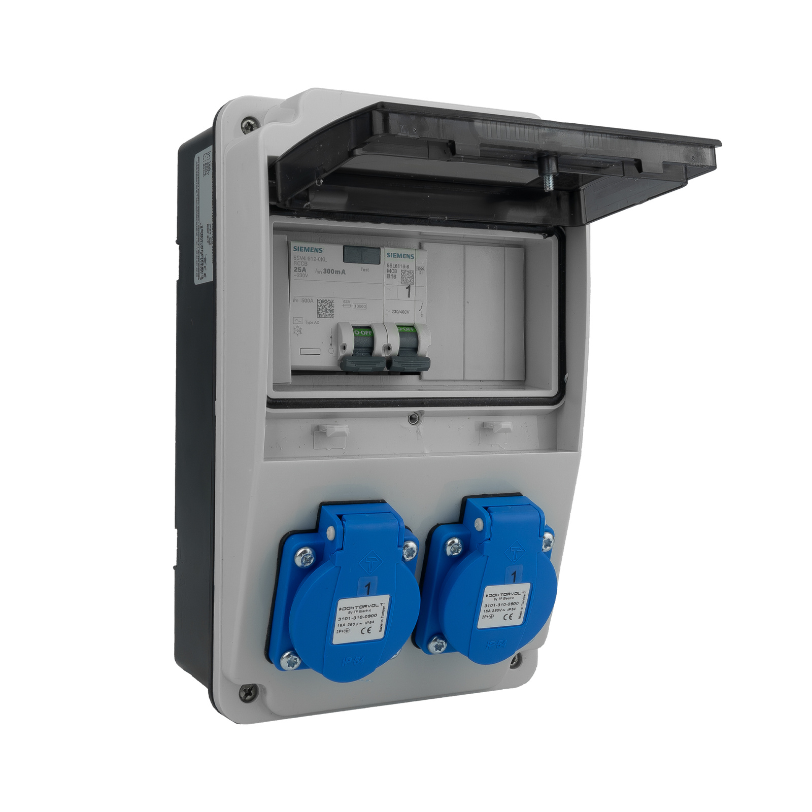 Hochwertiger Stromverteiler mit 2x230V 16A und Schuko-Steckdosen, ausgestattet mit Siemens. Ideal für Werkstatt, Baustelle und Industrie – zuverlässige Stromverteilung mit höchster Sicherheit.