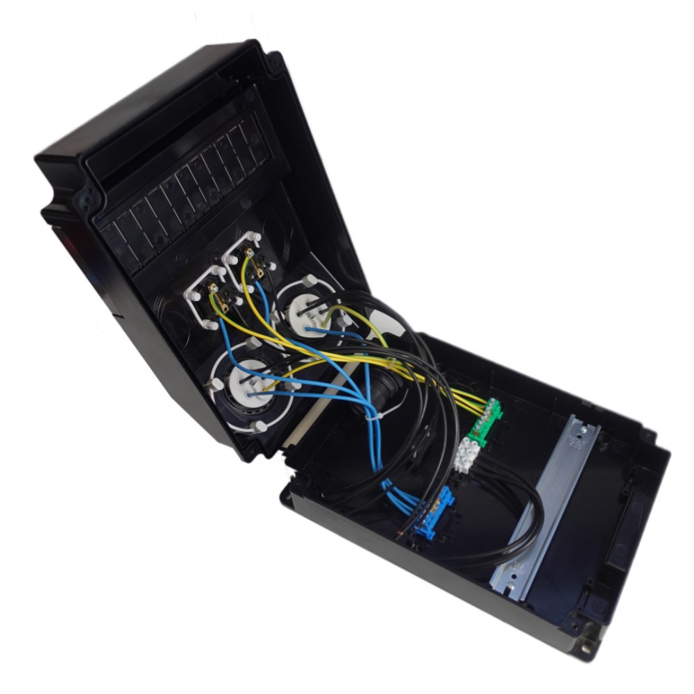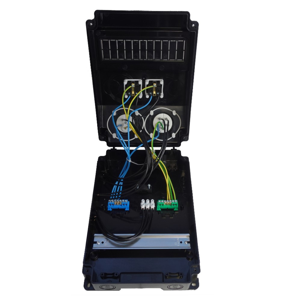 Stromverteiler mit schwarzem Gehäuse. Eignet sich ideal für dunkle Innenräume, z.B. Clubs, Bars, Restaurants, Hotels und überall wo weniger sichtbar sein soll
