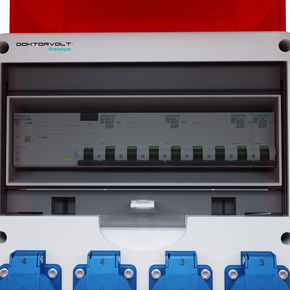 Rozdzielnica budowlana 32A 400V natynkowa Doktorvolt gniazda 4x230V Schuko 2x400V IP44 12 modułów zabezpieczenia Siemens wyłącznik różnicowoprądowy RCCB rozdzielnia elektryczna budowa przemysł warsztat CE TSE ISO 9001