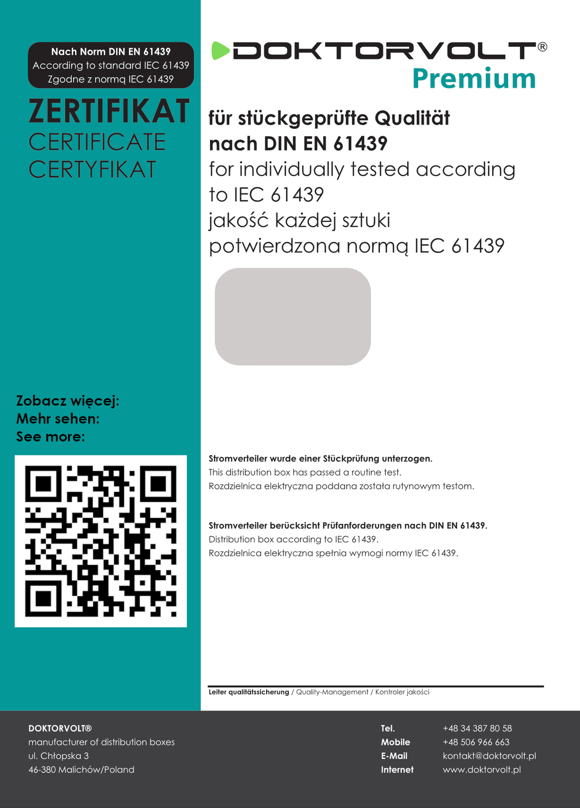 Firma Doktorvolt® została założona w 2013 roku. Dynamicznie rozwijające się przedsiębiorstwo zdobyło rynek polski i zagraniczny. Siedziba firmy mieści się w Malichowie w województwie opolskim, gdzie znajduje się nowoczesna hala produkcyjna i magazyn. Firma specjalizuje się w produkcji rozdzielnic budowlanych, wyróżniając się jakością i solidnością. Każda rozdzielnica zbudowana jest z wysokiej jakości komponentów. Produkty spełniają normy i standardy bezpieczeństwa obowiązujące w Unii Europejskiej.
