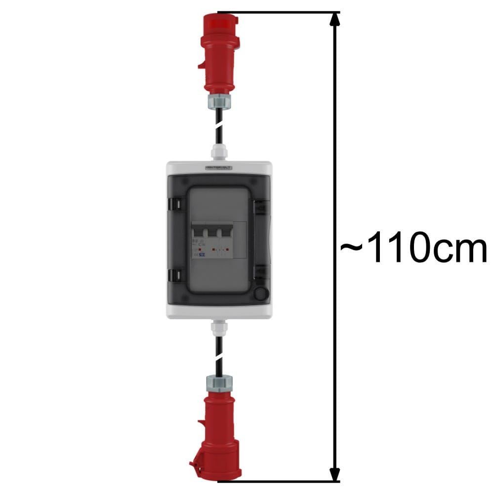 Siłowy adapter zabezpieczający, wyposażony w wyłącznik nadprądowy o charakterystyce C. Wykonany jest z wysokiej jakości komponentów. Wyłącznik C16 schowany jest w hermetycznej, 4-modułowej obudowie o stopniu ochrony IP65. Gniazdo i wtyczka marki Mennekes gwarantują niezawodność pracy.