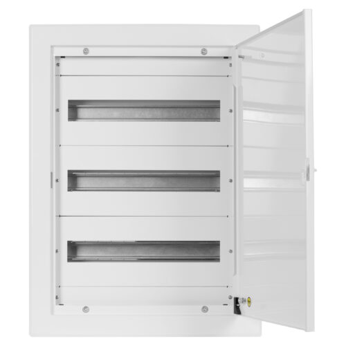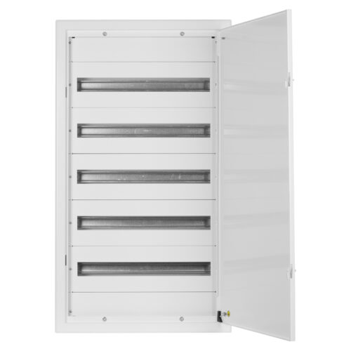 Rozdzielnica podtynkowa wyposażona w 8 rzędów o łącznej liczbie 144 modułów. Wykonana z stalowej blachy o grubości 1mm sprawdzi się w najbardziej wymagającym miejscu pracy. Rozdzielnica posiada również drzwi z zamkiem.