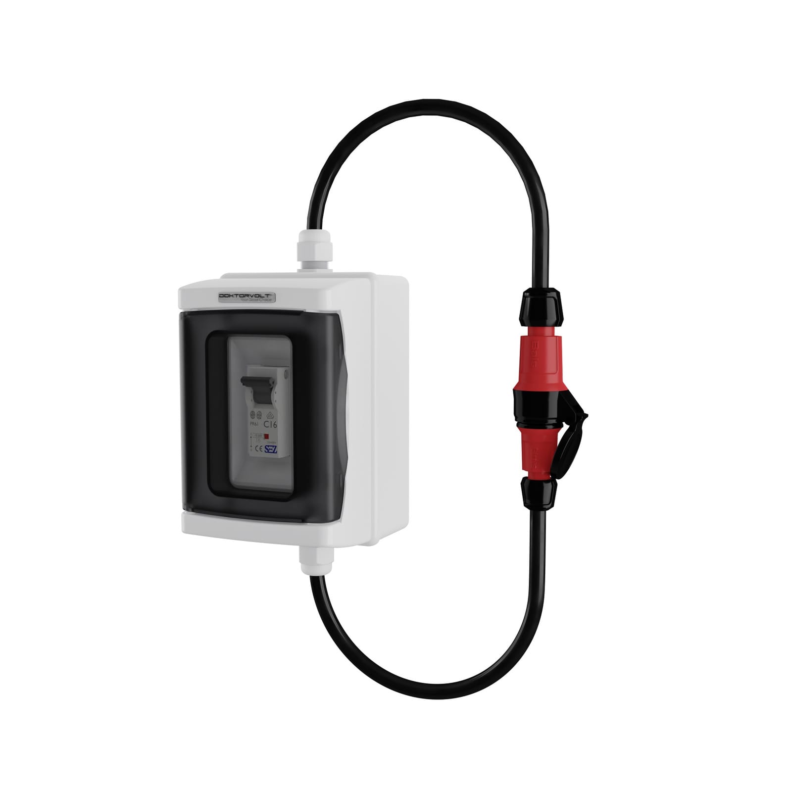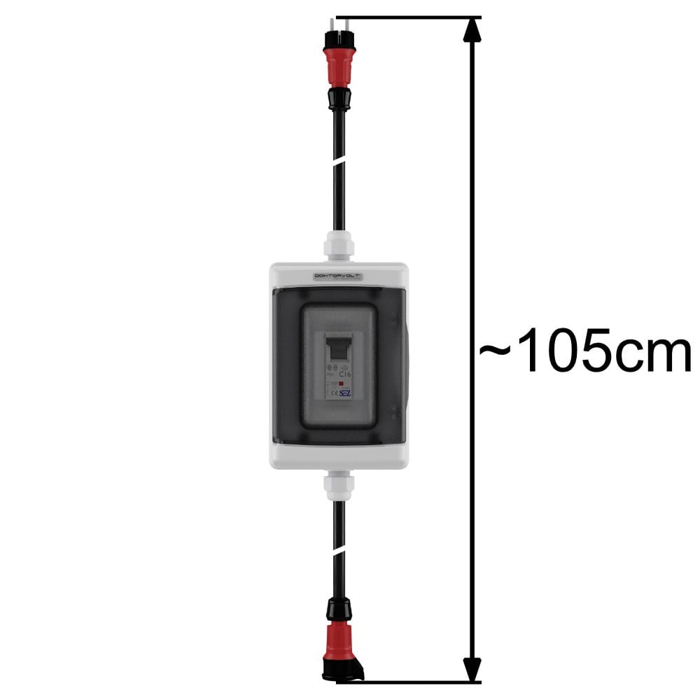 Adapter zabezpieczający 230V wyposażony w wyłącznik nadprądowy o charakterystyce C. Wykonany jest z wysokiej jakości komponentów. Wyłącznik C16 schowany jest w hermetycznej, 2-modułowej obudowie o stopniu ochrony IP65. Gniazdo i wtyczka marki Mennekes gwarantują niezawodność pracy.