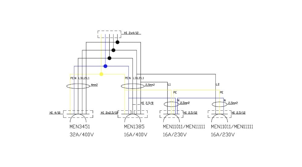1x 400 V 32 A IP44 czerwone Typ 3451 Mennekes 1x 400 V 16 A IP44 czerwone Typ 1385 Mennekes |