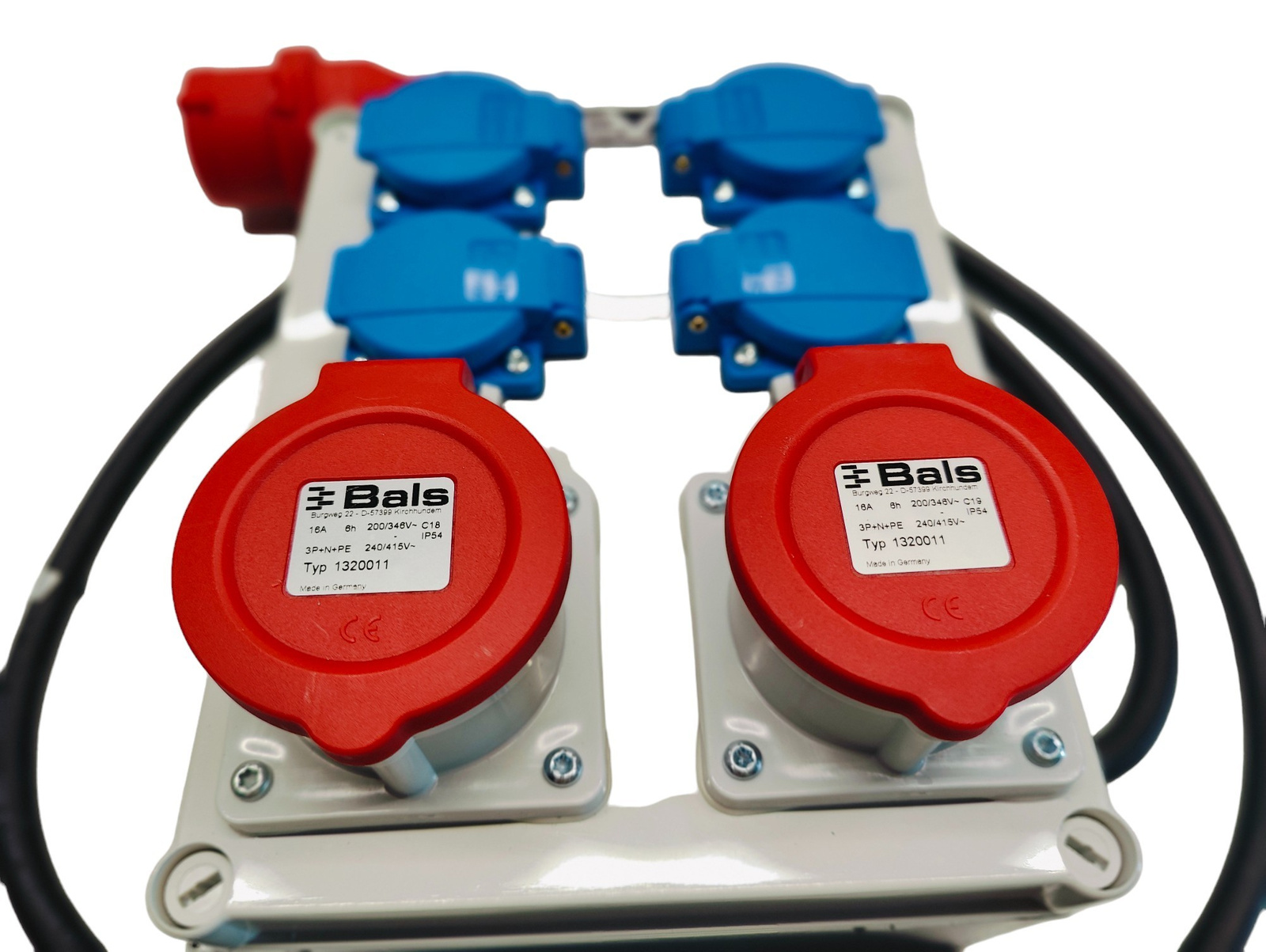 Gniazda 230V: 4x 230V 16A 2P+E IP54 niebieskie Typ F Bals Schuko System
