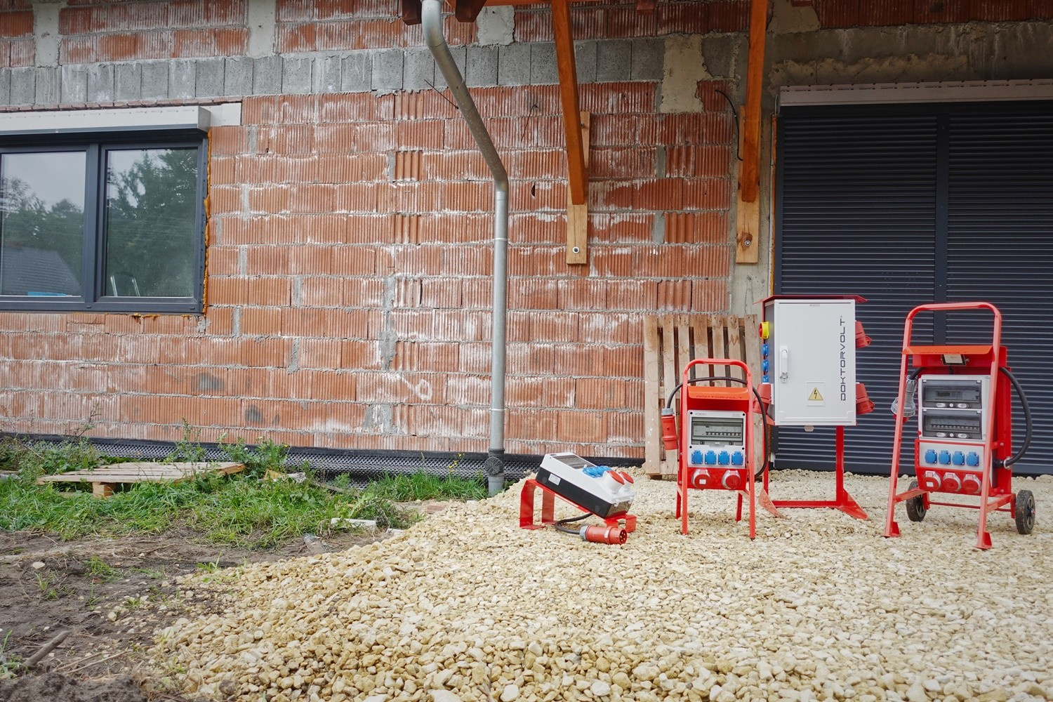 Przenośna rozdzielnica budowlana ze stojakiem i licznikiem zużycia energii. Odporna na warunki zewnętrzne, idealna na budowy, imprezy plenerowe i zakłady przemysłowe.