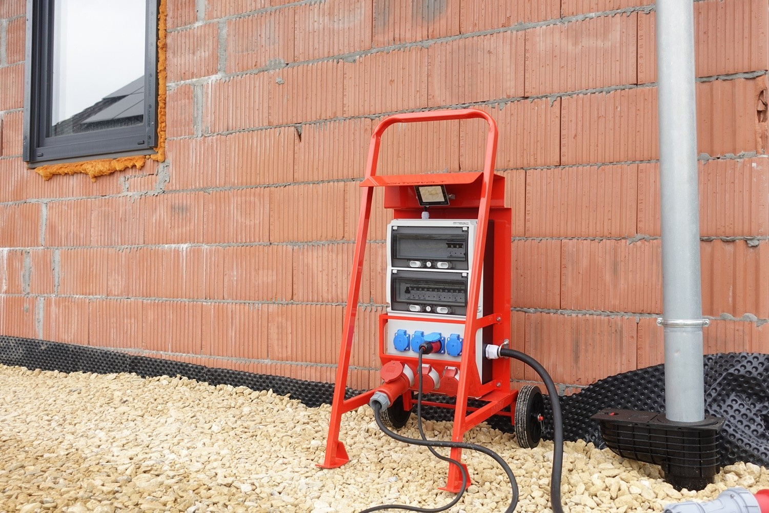Solidna rozdzielnica budowlana z oświetleniem LED, stojakiem i niemieckim systemem gniazd Schuko. Idealna do zastosowań na budowie, w przemyśle i podczas imprez plenerowych.