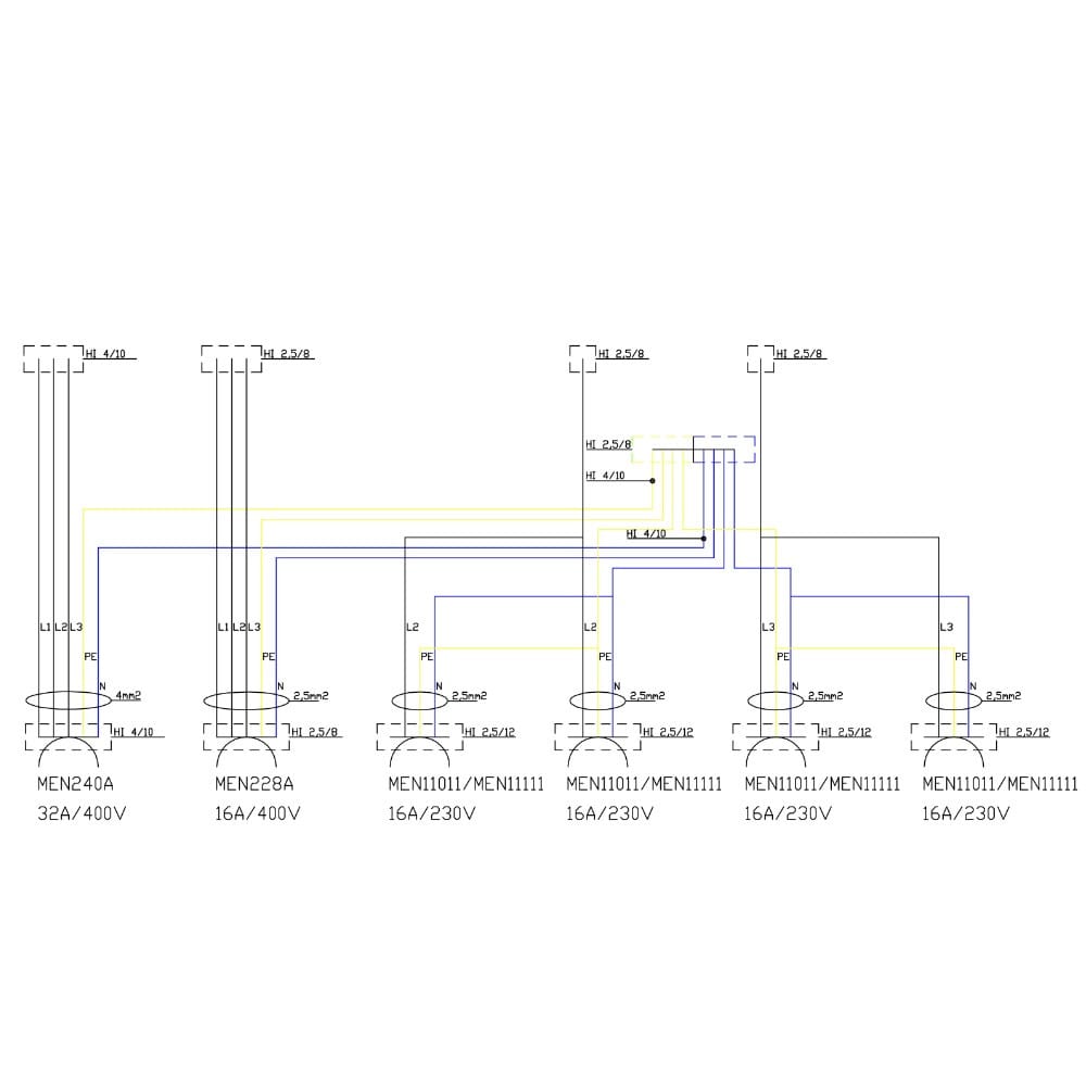| gniazda 230V | 4 x 230V 16A Mennekes 11011 IP54 2P+E Niemiecki system Schuko |