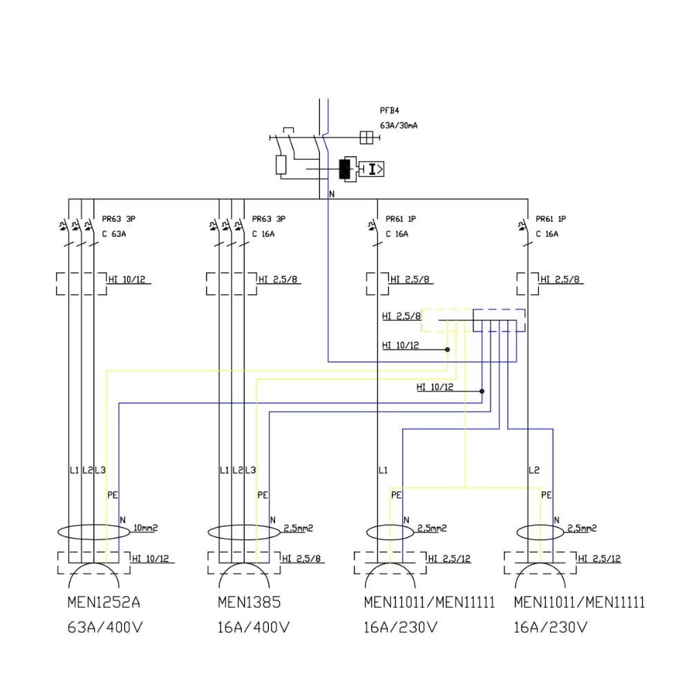 ✔️ zabezpieczenie nadprądowe gniazd siłowych C16 3P 10kA oraz C63 3P 10kA,