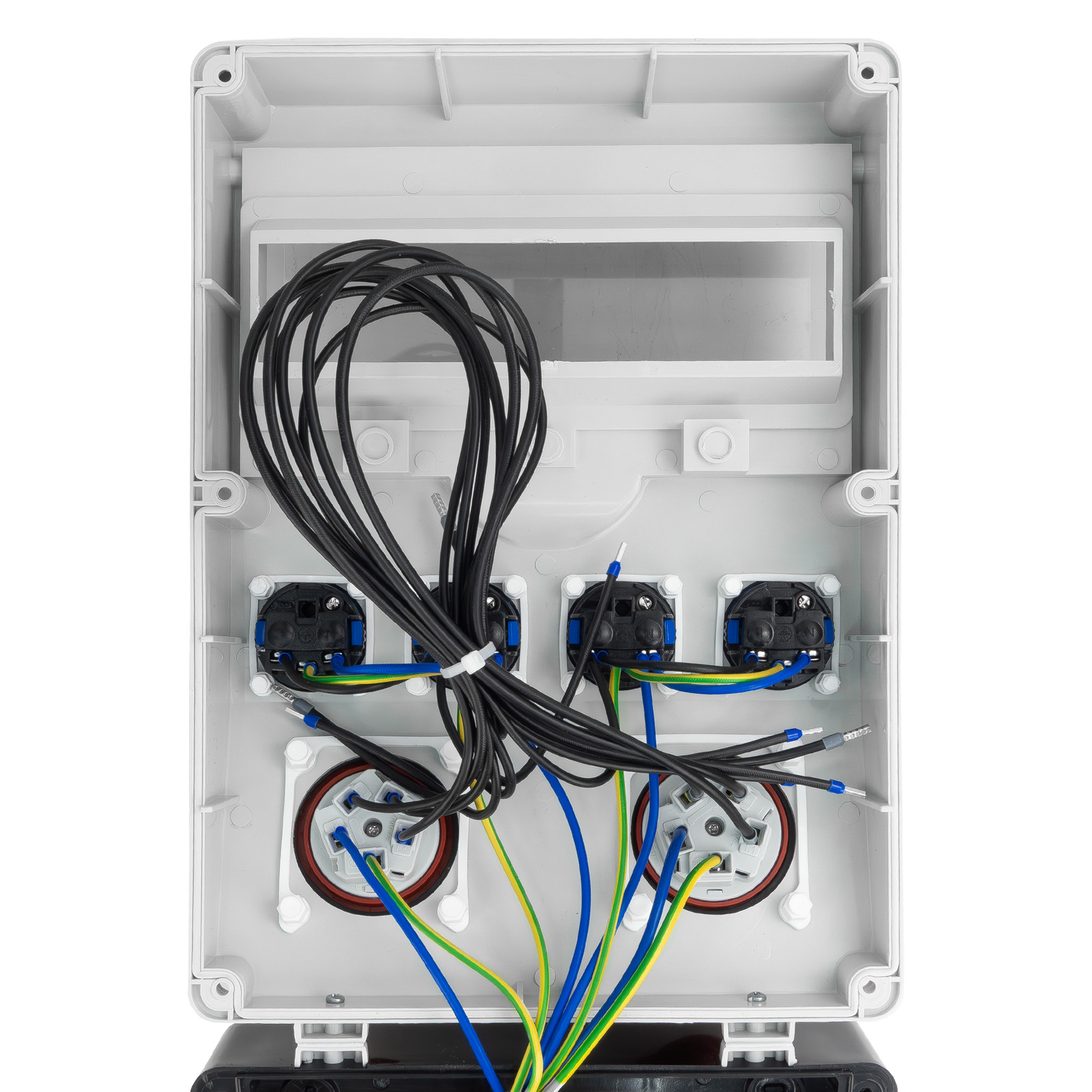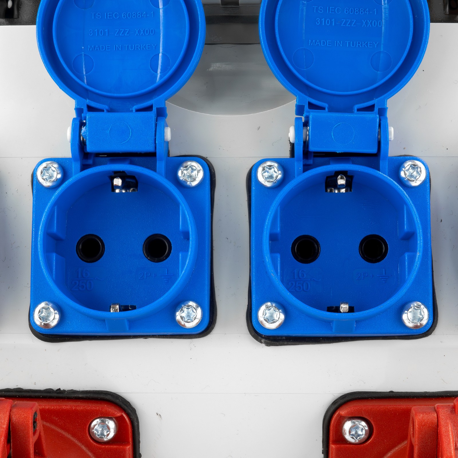 Rozdzielnica budowlana została wyposażona w gniazda 230V oraz gniazda siłowe. Jednoczesne podłączenie kilku urządzeń zapewniają dostępne cztery gniazda 230V. Dopełnieniem wszechstronności erbetki są dwa gniazda CEE 400V 16A i 32A.