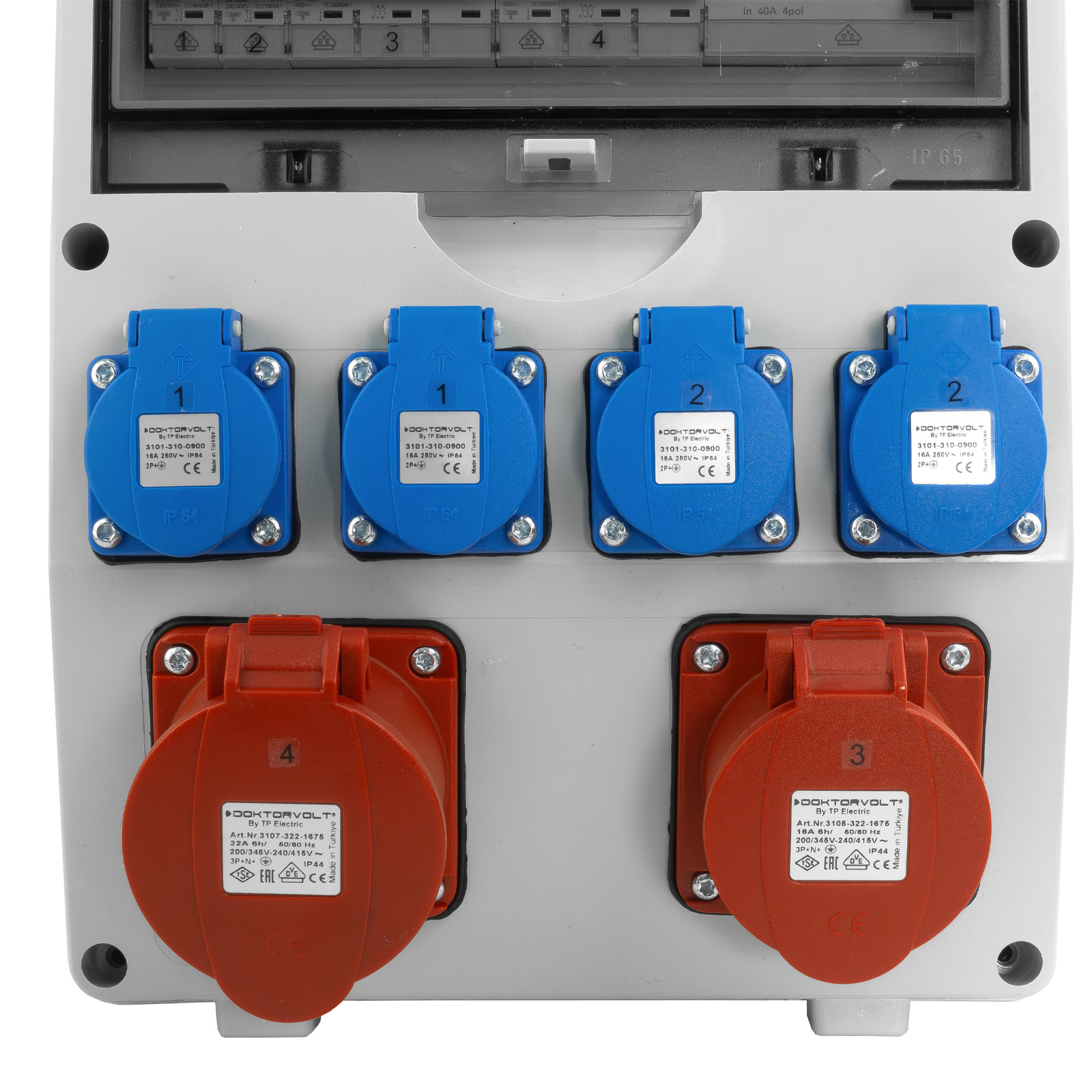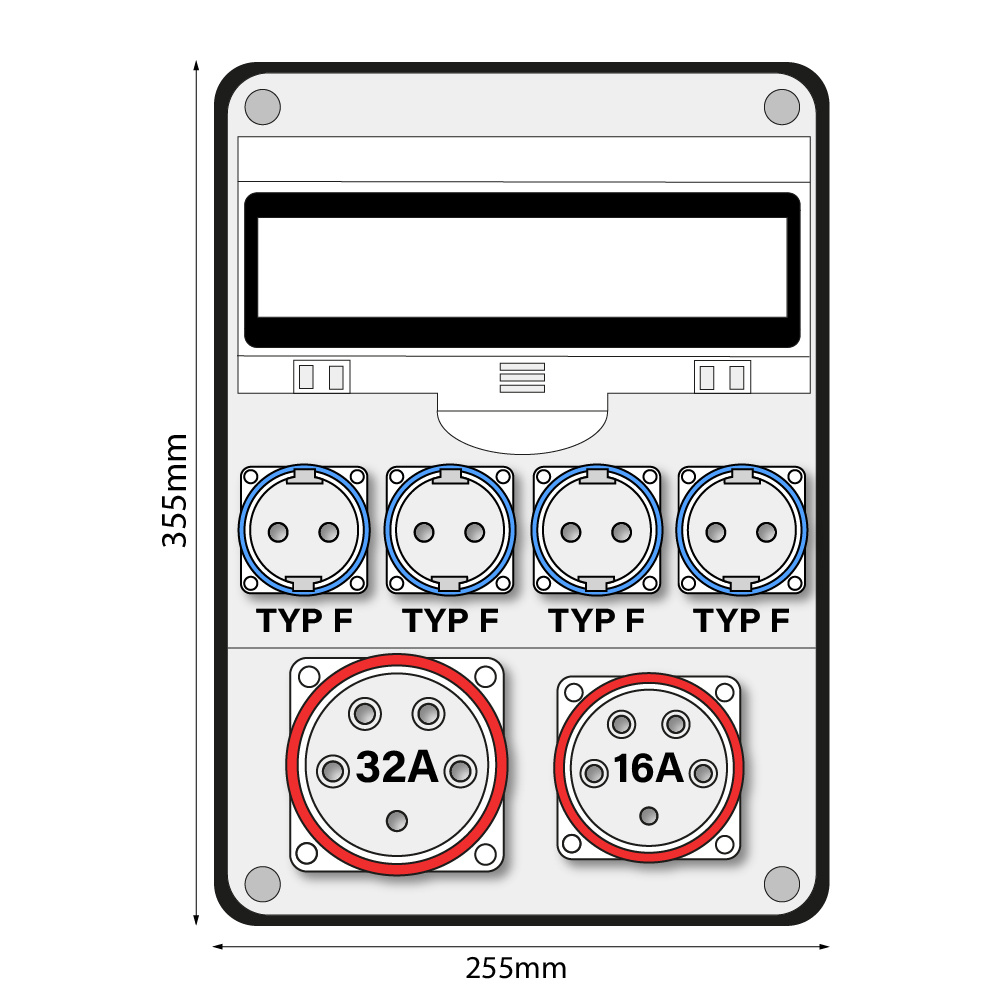 - 4 x 1 fazowe (SCHUKO): 1P + N + PE, 16 A, 230 V, IP54