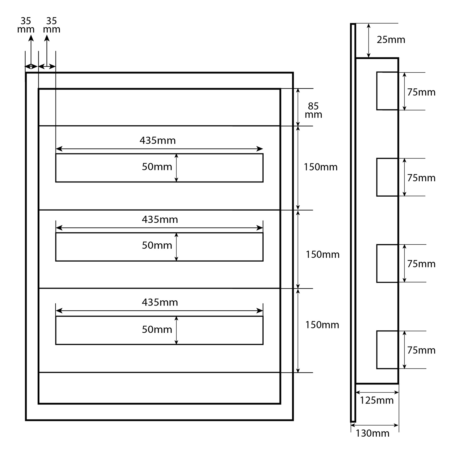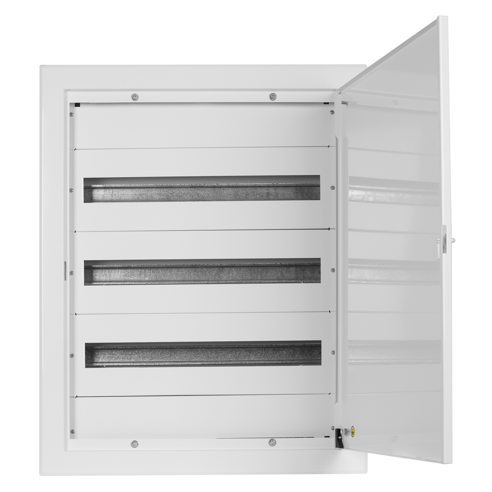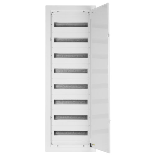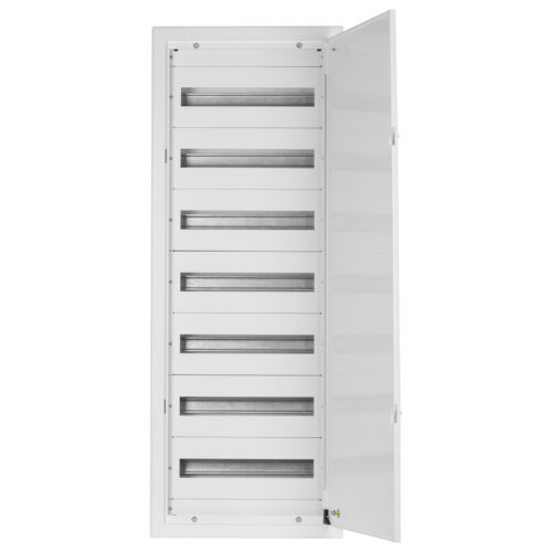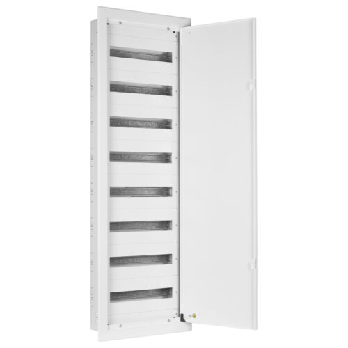 Rozdzielnica podtynkowa wyposażona w 3 rzędy o łącznej liczbie 72 modułów. Wykonana z stalowej blachy o grubości 1mm sprawdzi się w najbardziej wymagającym miejscu pracy. Rozdzielnica posiada również drzwi z zamkiem.