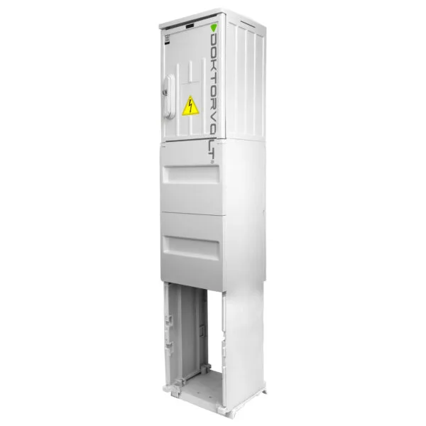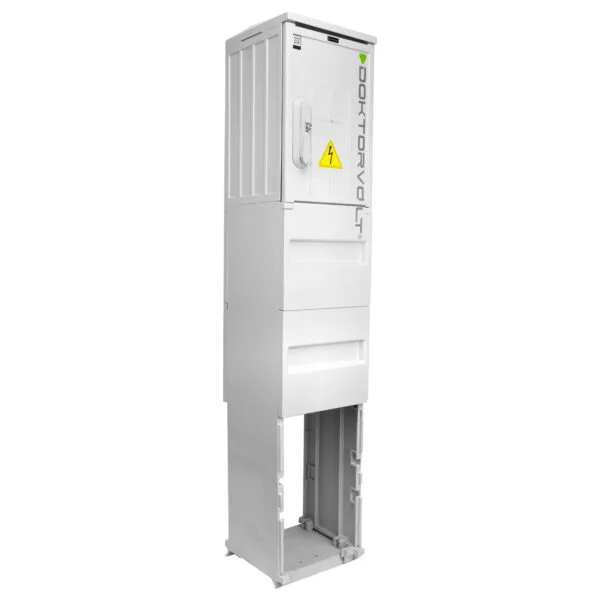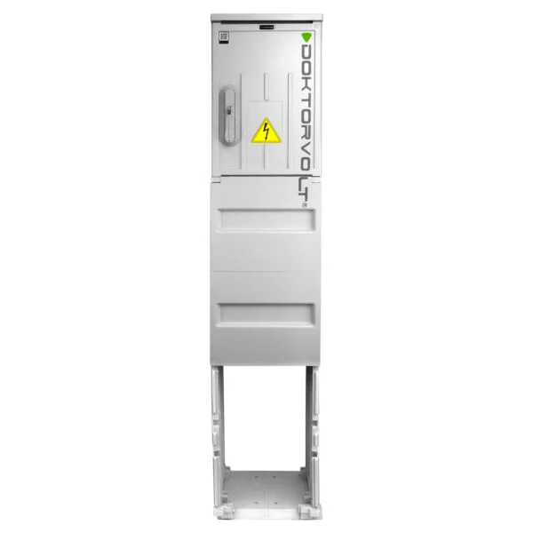 Rozdzielnica budowlana na fundamencie. Wykonana z najwyższej jakości materiałów, które zapewniają trwałość rozdzielnicy na lata. Poziom wkopania rozdzielnicy wynosi -600mm. Wyposażona w aparaturę zabezpieczeniową firmy Doktorvolt.