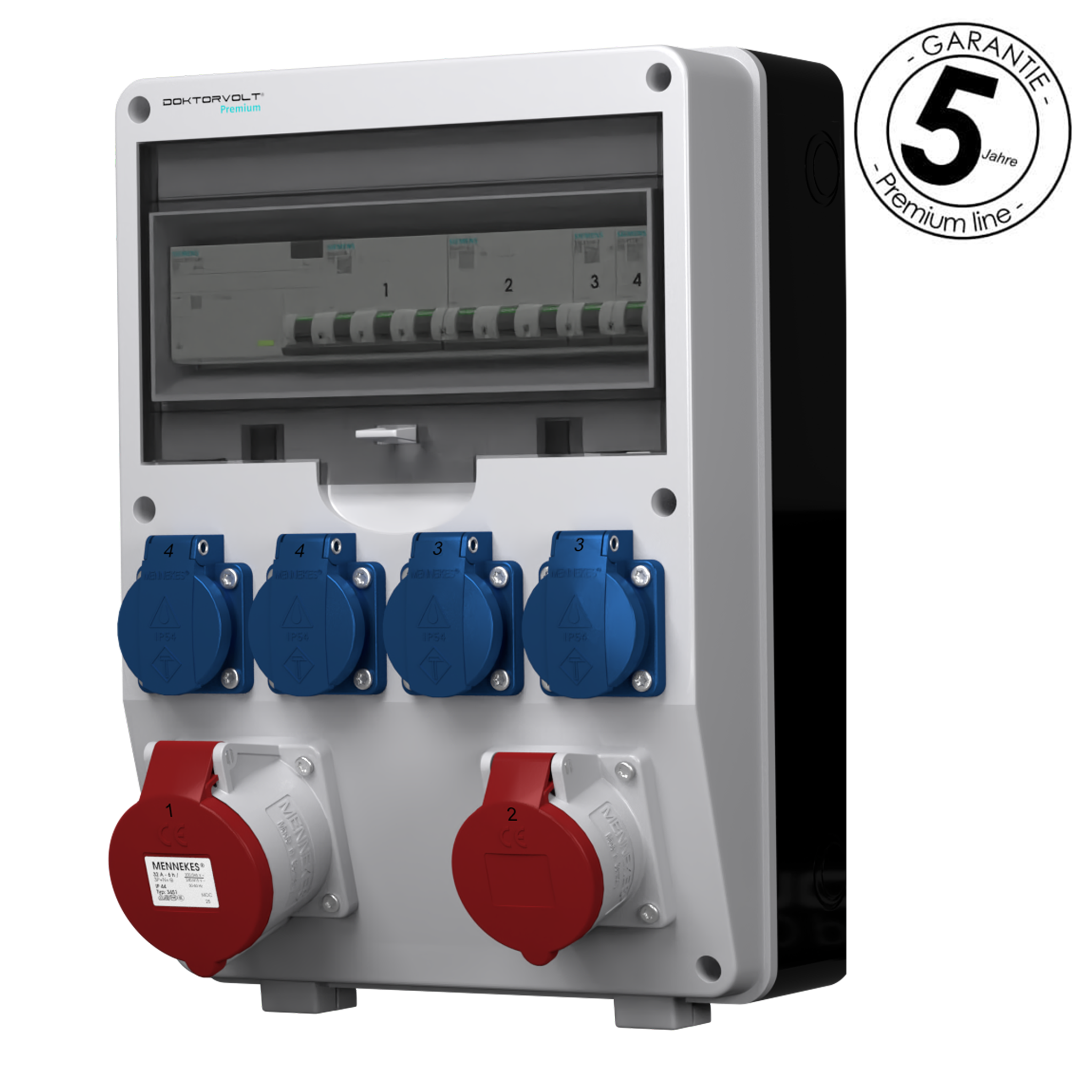 ✔️Prezentowana rozdzielnica elektryczna serii PREMIUM wyposażona została w gniazda siłowe 32A A 5P 400V, 16 A 5P 400 V o klasie szczelności IP 44 oraz w cztery gniazda 230 V 16 A 2p+E o klasie szczelności IP 54. Prąd znamionowy osprzętu elektrycznego wynosi 40 A, a klasa szczelności rozdzielnicy to IP 44. W zestawie z rozdzielnicą znajduje się szyna TH/TS 35, na której zamontowane są zabezpieczenia marki SIEMENS.