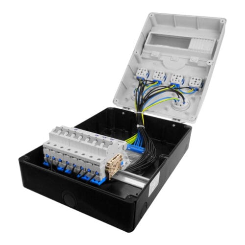 Wytrzymała rozdzielnica budowlana z 1x 32A, 1x 16A (CEE) i 3x 230V SCHUKO. Stopień ochrony IP54 – odporna na pył i zachlapania. Niezawodna na placach budowy i w warsztatach.