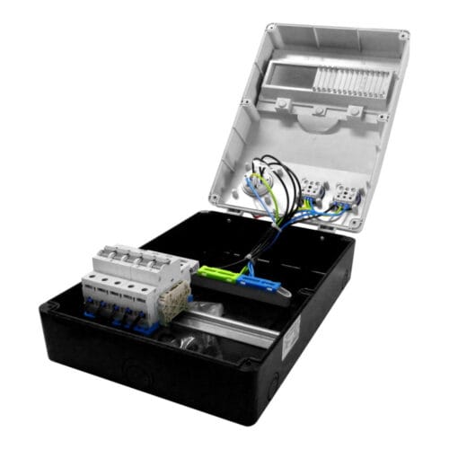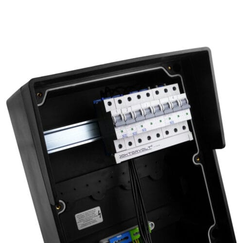 Zabezpieczona rozdzielnica budowlana serii JUN marki Doktorvolt. Wyposażona w gniazda siłowe 32A 16A oraz trzy gniazda 230V. Posiada zabezpieczenia nadprądowe renomowanej marki Siemens.
